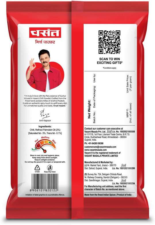 Vasant Chilli Powder is a packaged red chilli spice blend intended for household and commercial culinary use. The product is designed to provide a vibrant red color and balanced pungency to a variety of Indian dishes. The branding emphasizes quality and purity, and the front of the pack includes an image of a bowl filled with fine red chilli powder along with whole dried red chillies. A spokesperson/model is also pictured on the pack, supporting brand messaging, which includes a Hindi slogan printed near the bottom of the pack: